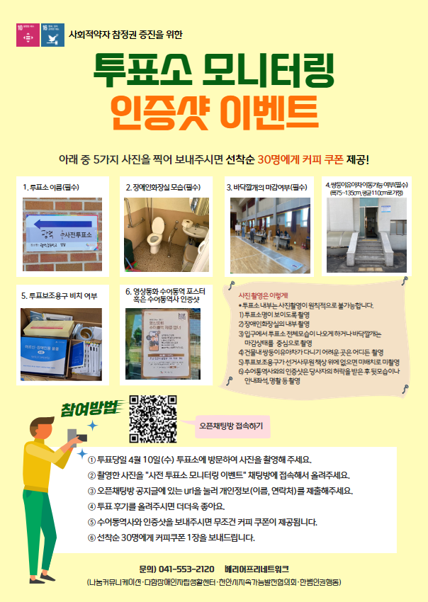 사전투표소에 이러한 편의시설에 대한 현황을 오픈채팅방에 공유해주시면 선착순으로 소정의 선물이 제공됩니다.